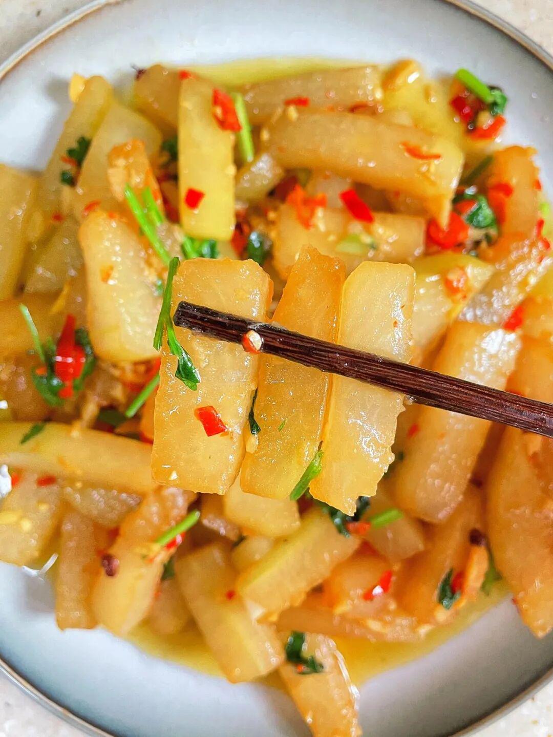 1、准备半个冬瓜,去皮清洗干净,改刀切成条。起锅烧油,油热下入冬瓜,加入1勺盐,翻炒均匀,盛出备用。