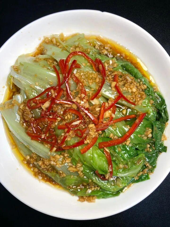 2、起锅烧水,加入少许盐和食用油,水开放入生菜,焯烫30秒捞出,摆入盘中,最后淋入调好的料汁即可。