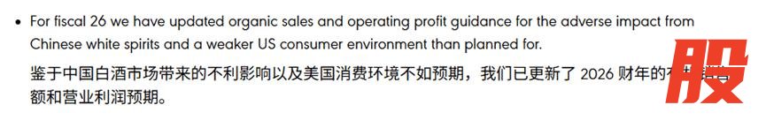 帝亚吉欧2026财年第一季度交易声明提到,大中华区拉低了亚太地区的销售额7.5%,该地区销量和净销售额均出现两位数的大幅下滑,主要原因是中国白酒消费场景减少,导致该地区净销售额下降约13%,集团净销售额下降约2.5%。
