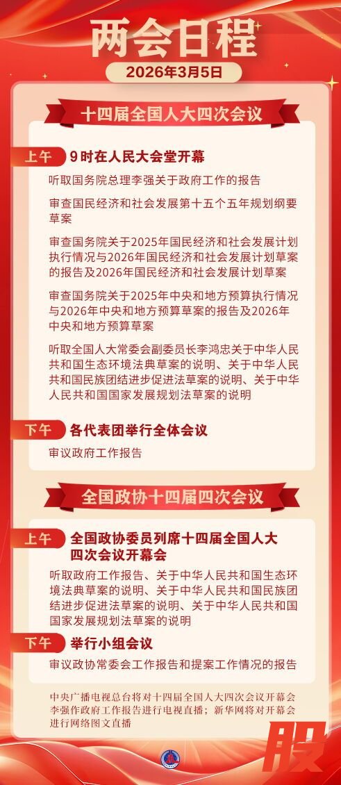 两会日程预告|3月5日:十四届全国人大四次会议上午9时开幕两会日程预告|3月5日:十四届全国人大四次会议上午9时开幕